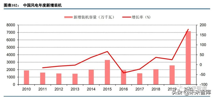 2020 年风电爆发式成长,主要原因是风电补贴政策变化导致的,在陆上风电去补贴政策影响下,抢装潮导 致装机容量大幅度增长。此外,2020 年装机大幅攀升也同电网企业并网统计口径有关系,2019 年存在完成吊装 但尚未并网装机容量达到 2600 多万千瓦,同 2020 年新增吊装容量一同计入 2020 年的新增数据。