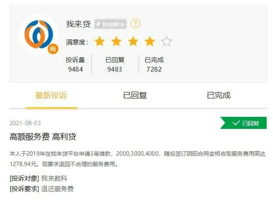 据黑猫投诉数据显示,截至目前,有关“我来贷”的相关投诉高达9484条,用户投诉的问题大多数均涉及“高额服务费、利率高和暴力催收”等主题。不过,金融虎APP注意到,在回复用户投诉的处理方式上,我来数科方面的回复和完成率比较良好。