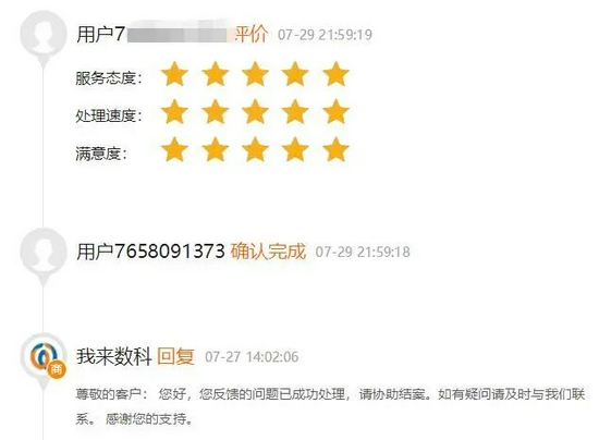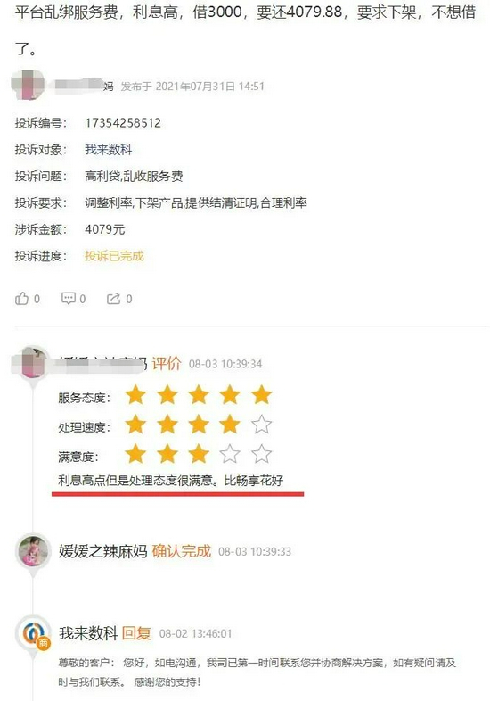 据金融虎APP观察,从7月下旬至今,针对“利息高和催收”问题的投诉,我来数科处理结果的回复大多数为“您反馈的问题已成功处理,请协助结案。”。而在用户针对其服务态度、处理速度以及满意度的评价上,打“四星和五星”的用户不在少数。这也意味着,在消费者与平台方协商争议的处理过程中,不少用户获得了较为满意的处理结果。而通过消费者平台进行投诉,也是维护自身权益的一种有效手段。