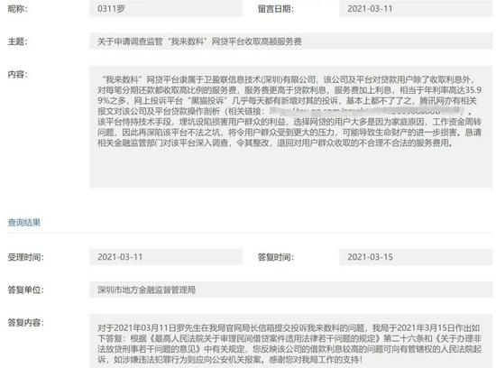 据了解,今年3月11日,就已有一名用户在深圳地方金融监督管理局官网局长信交上提交投诉。该名用户当时称:““我来数科”网贷平台隶属于卫盈联信息技术(深圳)有限公司,该公司及平台对贷款用户除了收取利息外,对每笔分期还款都收取高比例的服务费,服务费更高于贷款利息,服务费加上利息,相当于年利率高达35.99%之多,网上投诉平台“黑猫投诉”几乎每天都有新增对其的投诉,基本上都不了了之。该平台恃持技术手段,埋坑设陷损害用户群众的利益...恳请相关金融监管部门对该平台深入调查,令其整改,退回对用户群众收取的不合理不合法的服务费用。”