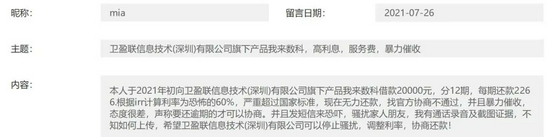 7月26日,这名用户在投诉中表示:“其于2021年初向卫盈联信息技术(深圳)有限公司旗下产品我来数科借款20000元,分12期,每期还款2266,根据irr计算利率为恐怖的60%,严重超过国家标准,现在无力还款,找官方协商不通过,并且暴力催收,态度很差,声称要还逾期的才可以协商。并且发短信来恐吓,骚扰家人朋友,我有通话录音及截图证据,不知如何上传,希望卫盈联信息技术(深圳)有限公司可以停止骚扰,调整利率,协商还款!”。