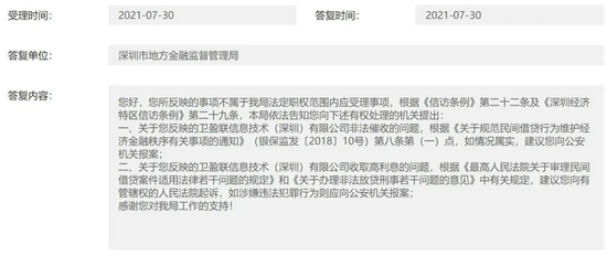 8月3日消息,近日,我来数科再度因“高利息,服务费,暴力催收”遭到用户投诉。深圳市地方金融监督管理局在回复这名用户投诉时指出,针对反映的卫盈联信息技术(深圳)有限公司涉及非法催收的问题,建议向公安机关报案;若涉及高利息问题,建议向有管辖权的人民法院起诉,如涉嫌违法犯罪则应向公安机关报案。