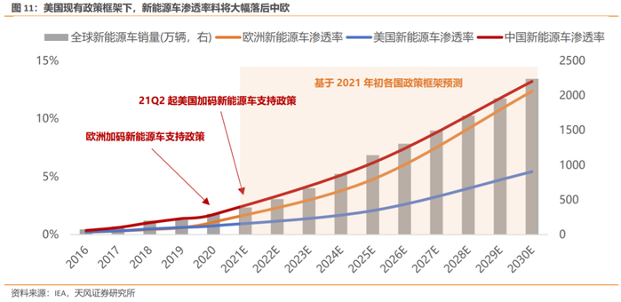受后疫情时代推进实现碳中和影响,中欧新能源车渗透率边际陡增,美国被动落入行业发展第二梯队,拜登政府加码新能源车政策有望延展全球产业扩张周期。根据IEA年初推算,美国新能源车渗透率未来十年将大幅落后于中欧。故5月起美国接连推出多项新能源车行业刺激政策,旨在弥合与新能源汽车第一梯队国家特别是中国的行业差距,具体措施包括提高消费者补贴、延长制造商补贴、加大政府与公共领域新能源车采购等,有望延长全球新能源车销量边际陡增周期。