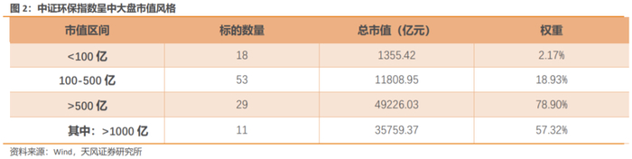 市值方面,中证环保指数呈中大盘风格。截至2021年7月30日,中证环保指数样本总市值中位数为232.07亿元,100-500亿市值中盘成分股数量占比53%,贡献18.93%权重,500亿以上市值大盘成分股数量占比29%,贡献78.90%权重,中大盘市值风格显著。