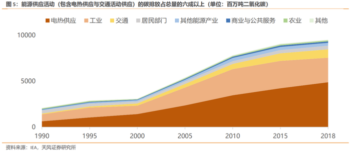 能源领域是我国二氧化碳排放控制以实现碳中和的主战场。2018年,电热供应部门碳排放规模为4896百万吨二氧化碳,占当年全国碳排放总量51.39%,考虑到交通部门碳排放主要来自石油产品供能,全年能源供应活动产生的碳排放共占61.02%,是降低二氧化碳排放工作的重中之重。因此我们认为,中央提出碳中和并给予高度重视,表观层面是出于环境保护的考量,但核心目的在于引导一场能源领域内革命以提供经济长足发展的基础。
