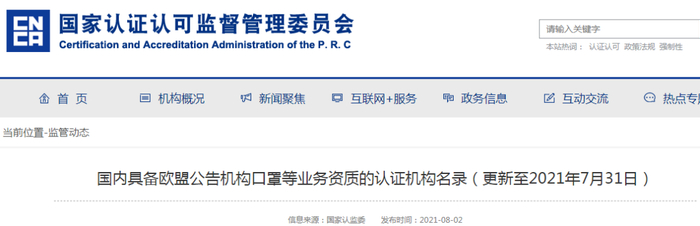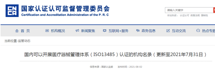 中国质量新闻网讯 近日,认监委发布国内可以开展医疗器械管理体系(ISO13485)认证的机构名录(更新至2021年7月31日)及国内具备欧盟公告机构口罩等业务资质的认证机构名录(更新至2021年7月31日)两份机构名单。