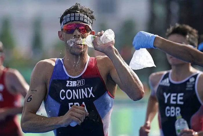 7月26日,东京奥运会铁人三项。法国选手多里安·科宁克斯喝水时,志愿者递过来一袋冰。图片:CFP