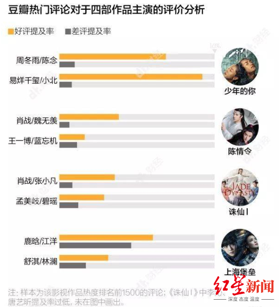 根据DT财经统计整理资料显示,在2019年流量明星的四部作品:《少年》《诛仙》《堡垒》和《陈情令》,整合了上述每部作品的前1500条热门评论,统计了各主演在好评、差评中提及的频率,发现对于绝大多数观众,大家吐槽更多的并不在流量明星身上,也就是说如今流量明星本身只是热剧中的一小部分。