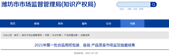 中国质量新闻网讯 近日,山东省潍坊市市场监督管理局发布2021年第一批食品用纸包装、容器产品质量市级监督抽查结果。