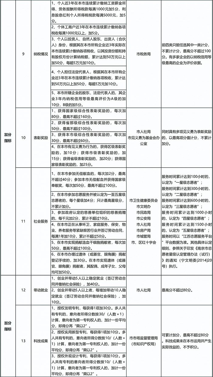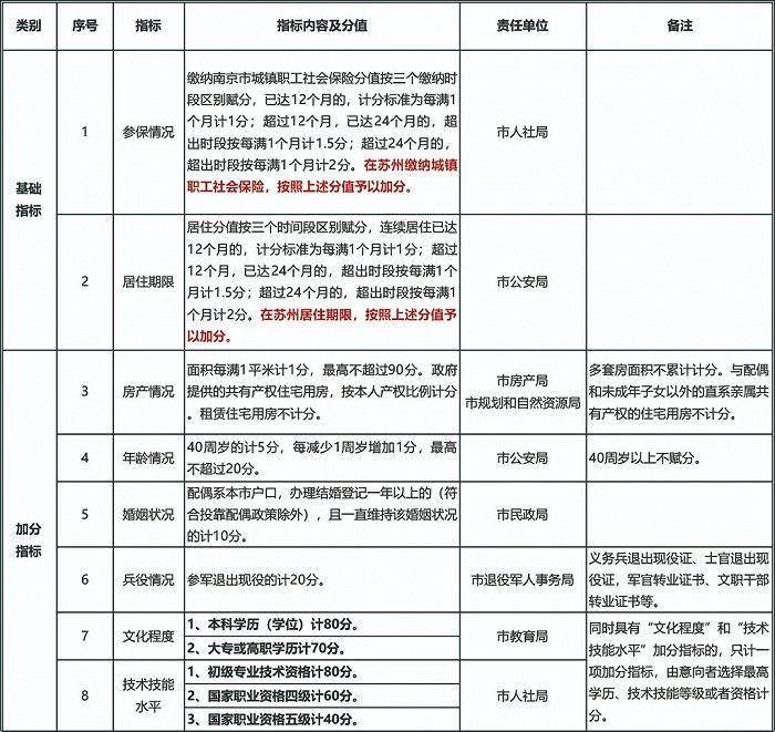 在苏州市参加城镇职工社会保险的,视为在南京市缴纳并赋分;在苏州市居住的,视为在南京市居住并赋分。积分落户指标由基础指标、加分指标和减分指标组成,累计积分达到100分,即符合落户条件。基础指标包括缴纳城镇职工社会保险、连续居住年限。