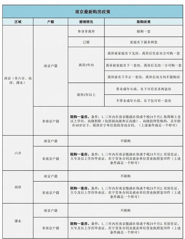1.南京主城(不含六合、高淳、溧水),夫妻离异的,任何一方自离异之日起2年内购买商品住房的,其拥有住房套数按离异前家庭总套数计算。