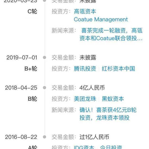 迄今为止,喜茶已完成5轮融资,投资阵容也堪称豪华——资方包括IDG资本、龙珠资本、红杉中国、高瓴资本等知名投资机构。