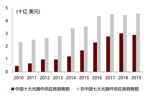 图表: 中国十大和非中国七大光器件供应商销售额
