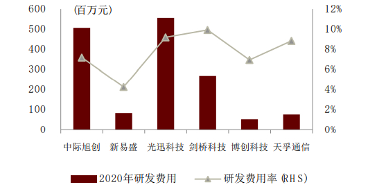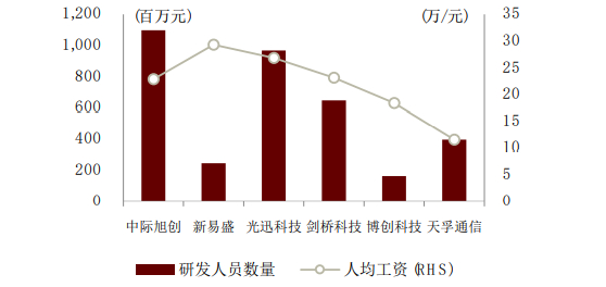 图表:旭创研发人员数量和工资水平比较(2020年)