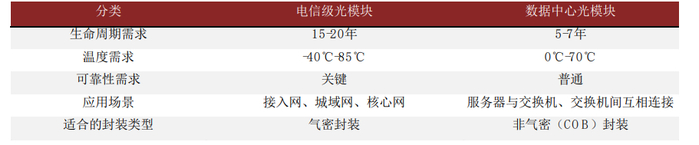 两个下游应用场景对光模块产品的性能要求存在区别,电信市场对可靠性要求更高,数通市场更注重性价比。电信级光模块一般要求光模块的寿命更长,为15-20年,工作的温度区间更广,为-40℃至85℃,可靠性的要求也更高,光收发组件适合采用气密封装;与之相比,数据中心光模块的寿命约为5-7年,温度区间为0℃-70℃,可靠性要求相对更低,TOSA/ROSA适合采用非气密封装。