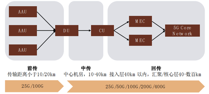 5G网络目前对光模块的需求主要集中于25G和100G的光模块。前传对光模块速率要求不高,目前主要使用25G SFP28光模块,在AAU与DU的光纤连接场景中有灰光光纤直连或彩光波分复用(CWDM、DWDM、LWDM、MWDM)等多种方案可供选择。中回传对光模块速率要求较高,80km以上超长距离传输主要采用高速率相干光模块方案。中回传光模块产品高端,技术壁垒相对更高,因此竞争格局更优,利润率水平一般高于前回传产品。我国中回传光模块的主要供应商包括光迅、新易盛、旭创、海思等。