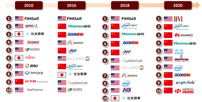图表:2020年全球十大光模块供应商变化情况(按销售额)