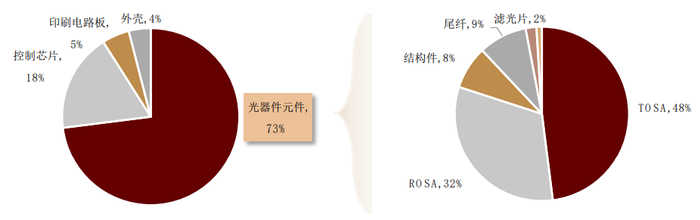 根据OFWeek数据(2018年),目前光模块的成本构成中,光器件元件占比达73%;其次是控制芯片(电芯片)占18%,而印刷电路板和外壳各占5%和4%。在光器件元件中,TOSA和ROSA有较高的技术壁垒,是主要成本所在,分别占48%和32%。