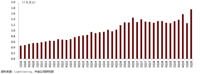 图表: 全球光模块市场规模(1Q10-2Q20)