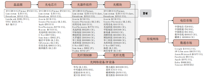 在整个光通信产业链中,光器件和光模块公司处于行业中游。产业链上游主要包括半导体材料、光电芯片(设计、制造、封装)供应商;产业链下游,光模块需配合电信设备、网络设备等使用,属于非终端产品,主要面向电信市场和数通市场两大类客户。