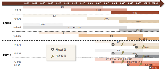 图表: 光模块迭代情况(电信市场2006-2022E;数据中心2015-2022E)