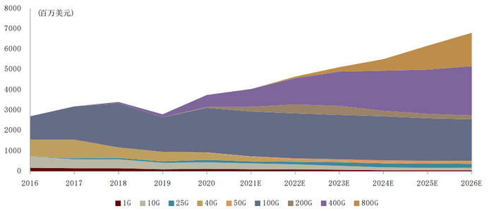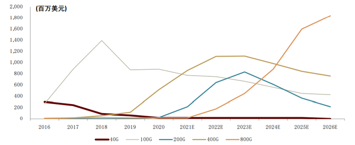 图表:100G/200G/400G/800G全球光模块市场营收预测