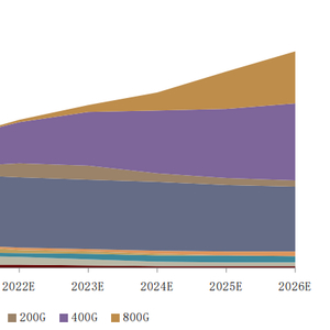 高速光模块是市场增长的主要驱动因素,北美部分互联网客户正式部署400G。根据LightCounting预测,400G光模块在100G及以上光模块市场营收中的占比将从2020年的20.9%提升至2026年的38.5%;800G光模块在100G及以上光模块市场营收中的占比将从2022年的1.8%提升至2026年的26.1%。