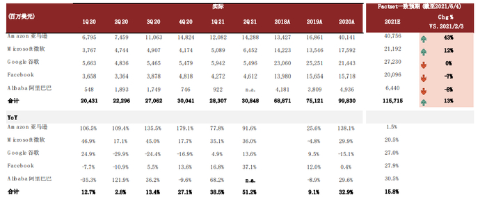 根据Factset数据,当前市场对光模块Top5云计算客户2021年资本开支之和的一致预期为1157亿美元,对应同比增速为15.8%;相比于一季度,一致预期上修了13%。2H21我们看好后疫情时代数字化进程加速,以及疫情改善有利于数据中心建设端的压力释放,维持对海外云厂商资本开支稳中向好的预判。
