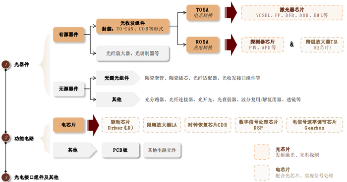 光模块是由光器件(包括光收发组件)、功能电路和光电接口组件等封装而成。光器件包含有源器件、无源器件等,其中有源器件的核心是光收发组件,激光器、光探测器等以光芯片的形式封装在光收发组件中,是光模块中技术含量最高的部分。
