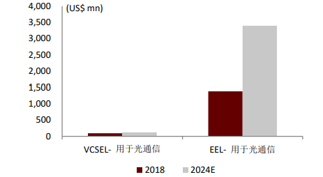 激光器:根据Yole预计,用于光通信的VCSEL和EEL边发射激光器全球市场规模将分别从2018年的0.92亿美元和13.85亿美元增长到2024年的1.2亿和30亿美元,CAGR分别为4.5%和13.7%。