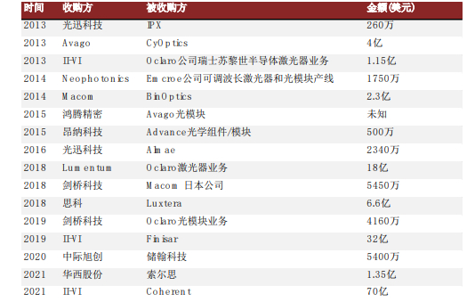 近年来光通信领域呈现并购整合趋势,资本助力中国厂商外延扩展生产能力。自2001年以来,随着西方互联网泡沫破灭,用于电信业的光器件需求下降,供给过剩导致行业盈利水平下滑,光模块供应商将生产环节逐渐转移到人工成本较低的中国,以降低成本、维持生计。此后,中国企业快速积淀了光器件的制造经验,更多本土企业发展起来。近年来,剑桥、博创、天孚等越来越多的国产光器件厂商,在资本市场资金的支持下,收购了优质且估值合理的海外资产,不断拓宽产品线、拓展技术能力。我们观察到中国厂商正快速崛起,资本助力和厂商能力提升形成正循环,未来有望抢占更多的市场份额。