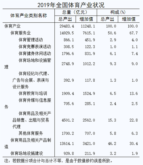 其中更重要的一个数据是,体育服务业已经占据了体育产业的半壁江山,2019年达到1.49万亿元,占全年增加值的67.7%。
