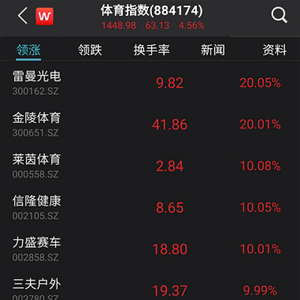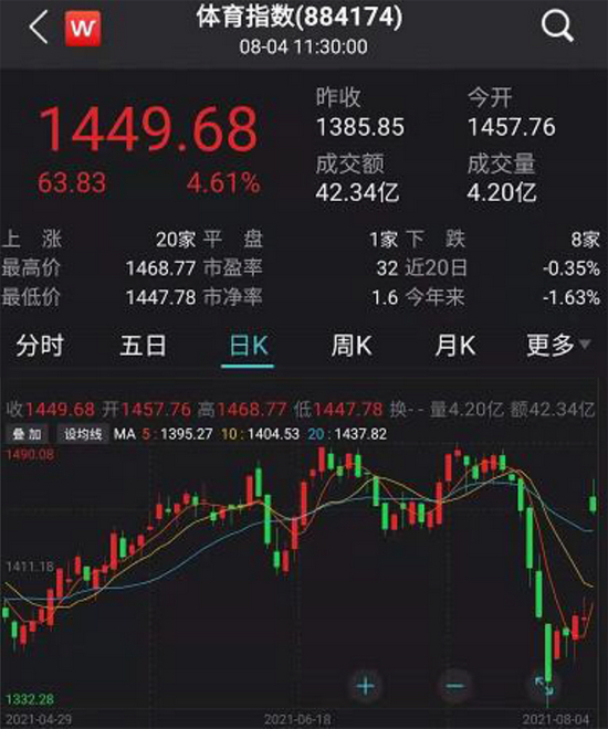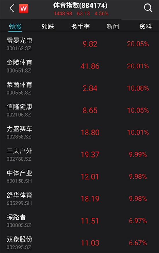 Wind体育指数也随之大涨,截至发稿,指数整体上涨4.61%,创下近期以来最大单日涨幅。