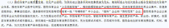 《全民健身计划(2021—2025年)》的主要任务显示,为促进体育资源向优质企业集中,相关部门将在健身设施供给、赛事活动组织、健身器材研发制造等领域培育一批“专精特新”中小企业、“瞪羚”企业和“隐形冠军”企业,鼓励有条件企业以单项冠军企业为目标做强做优做大。