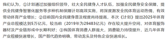 天风证券认为,目前国内全民健身普及程度尚待提高,本次《计划》提出2025年体育产业总规模达到5万亿元,较当前(2019年为29483亿元)存在较大提升空间,对体育服饰器材及产业链形成中长期利好。