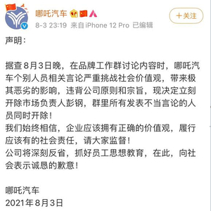 一语成谶,求锤得锤。随着该截图在社交平台疯传后,哪吒汽车、投资方360公司以及哪吒汽车CEO张勇分别在当晚发布声明称,开除所有发表不当言论人员,其中专门提到市场负责人彭钢被立即开除。