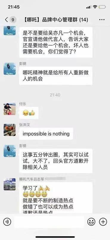 据媒体报道,8月3日晚,广告从业人士彭钢在哪吒汽车的品牌中心管理群中发言,“是不是要给吴亦凡一个机会,官宣请他做代言人,告诉大家还是要给他一个机会,坏人也需要机会。”“哪吒精神就是给所有人重新做人的机会”。他还表示,“这事五分钟出圈,其实可以试试,大不了,回头官方道歉开除相关人员。”