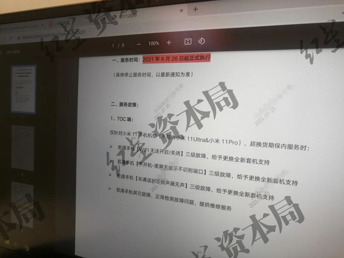 王西给红星资本局展示了一张照片,照片上售后工作人员的电脑屏幕显示:“若遇手机(WiFi无法开启/关闭)三级故障,给予更换全新套机支持”,并且标注:2021年6月26日起正式执行,仅针对小米11手机机型(不包含小米11Ultra&小米11Pro)。王西认为,小米内部既然出台了这样的售后政策,那就是默认小米11是有问题的。