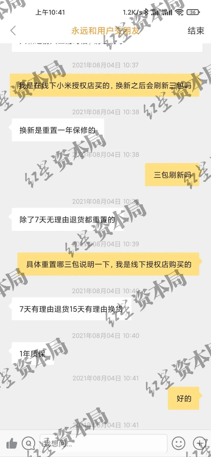 小米客服表示更换的新机不支持“七天无理由退货”