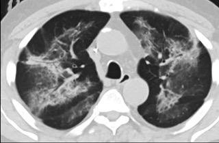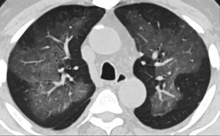 6天后的轴向CT平扫图像显示毛玻璃影变为实变和轻度结构扭曲。(同一病人CT影像)