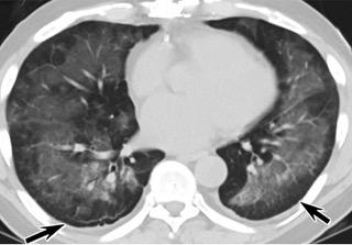中、下肺轴位CT平扫显示毛玻璃样混浊伴胸膜下保留(箭头)。(同一病人CT影像)