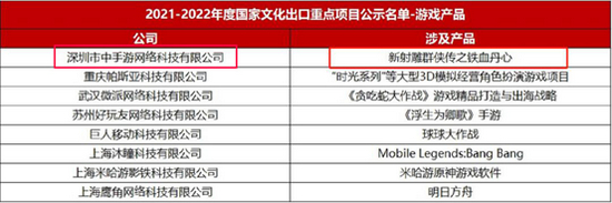 日前,国家商务部公布了《2021-2022年度国家文化出口重点企业和重点项目名单的通知》,共有369家企业和122个项目入选。包括全球化IP游戏生态公司中手游在内,共有58家游戏公司入选了国家文化出口重点企业名单。此外,中手游于年初推向海外市场的游戏《新射雕群侠传之铁血丹心》亦以不俗的成绩入选年度国家文化出口重点项目名单。