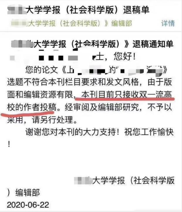 投稿者在网上晒的某大学学报(社会科学版)拒稿邮件。期刊名已作处理。