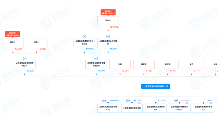 海高通信前三大股东为上海星地通通信科技有限公司(以下简称上海星地通)持股20%、北京赛普工信投资管理有限公司(以下简称北京赛普)持股16%、刘青持股12.25%。北京赛普又由上海星地通持股60%、上海星地通讯工程研究所持股40%。