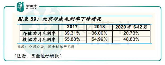 此外,北京君正收购北京矽成时,北京矽成芯片可辨认公允价值高于账面价值。北京君正收购时按可辨认公允价值入账为存货,存货售出时再转结为销售成本,导致存储芯片和模拟芯片毛利率产生一定程度下滑。