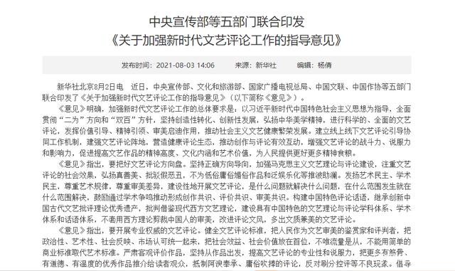 ▲中央宣传部等五部门联合印发《关于加强新时代文艺评论工作的指导意见》。图片来源:中华人民共和国文化和旅游部官网截图