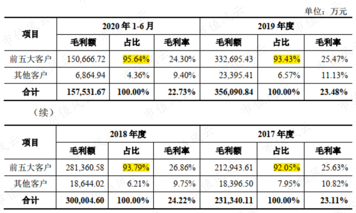 而真正给力的更是只有前五大客户。根据招股书信息,历年来前五大客户营收贡献超过80%,毛利贡献更是超过90%。