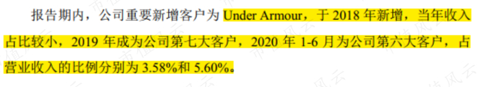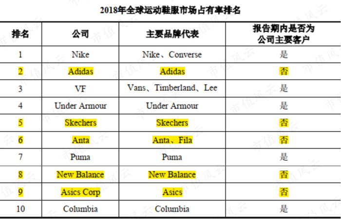 六大(包括Under Armour)重要客户中,有五位都是2018年全球运动鞋服排名前十的企业。