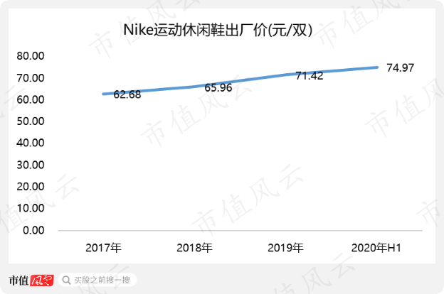 不过不算不知道,一算痔疮都笑迸了:虽然出厂价逐年上升,但2020年上半年,给Nike代工的运动休闲鞋销售给Nike时不过74.97元/双。