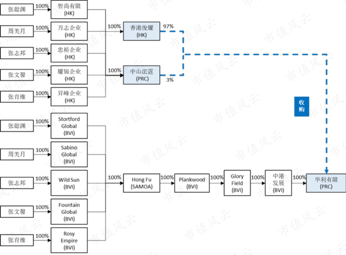 这次股权转让不涉及实控人变更,目的很简单,就是简化、明晰华利有限的股权结构:将张聪渊家族(妻子周美月及三个子女)原通过英属维尔京群岛(BVI)对华利有限的层层持股结构,调整成通过在香港注册公司持有。